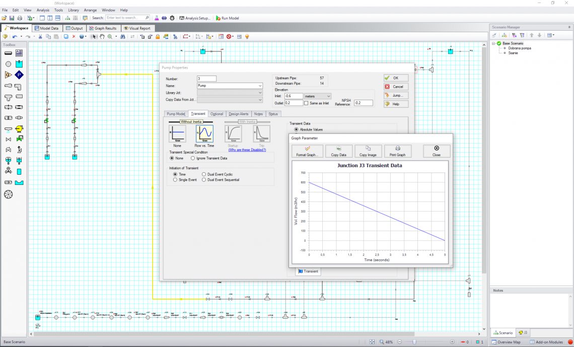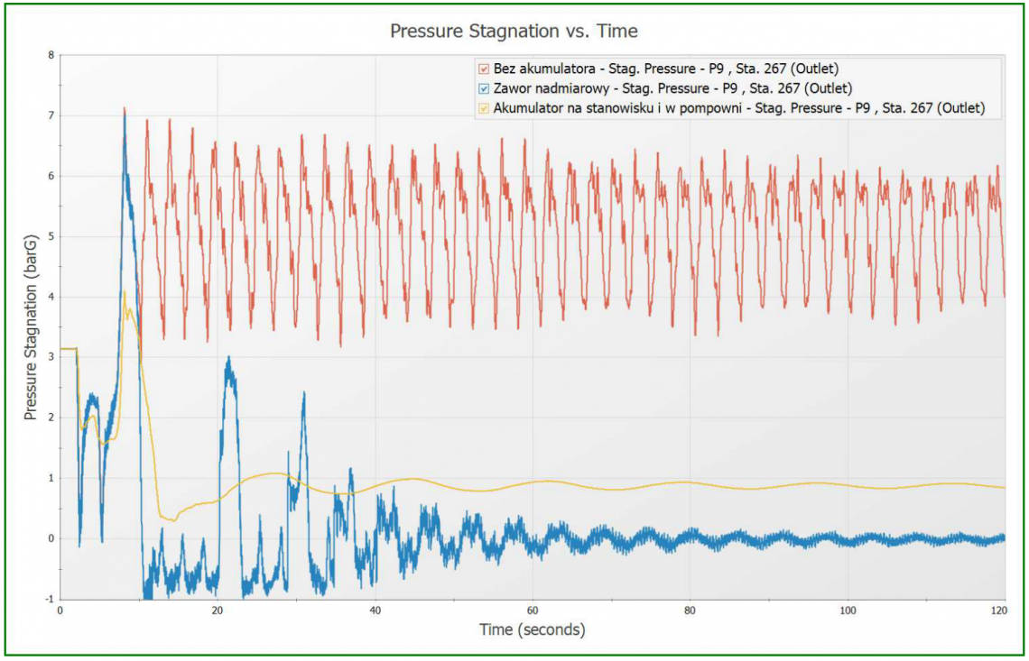 W celu zabezpieczenia instalacji wykonaliśmy szereg rozważań oraz analiz zmodernizowanego układu, przy wykorzystaniu różnych, często niekonwencjonalnych urządzeń prewencyjnych. Po wprowadzeniu zaproponowanych przez nas zaleceń, wspólnie z Zamawiającym przeprowadziliśmy szereg testów weryfikujących nasze rekomendacje. W trakcie prób okazało się, że zjawisko uderzenia hydraulicznego zostało ograniczone do poziomu nie powodującego zagrożenia. Okazało się, że po raz kolejny udało nam się wybrać optymalne rozwiązanie zwiększające bezpieczeństwo zakładu, dzięki któremu nie dopuścimy do powstania kolejnej poważnej awarii przemysłowej.