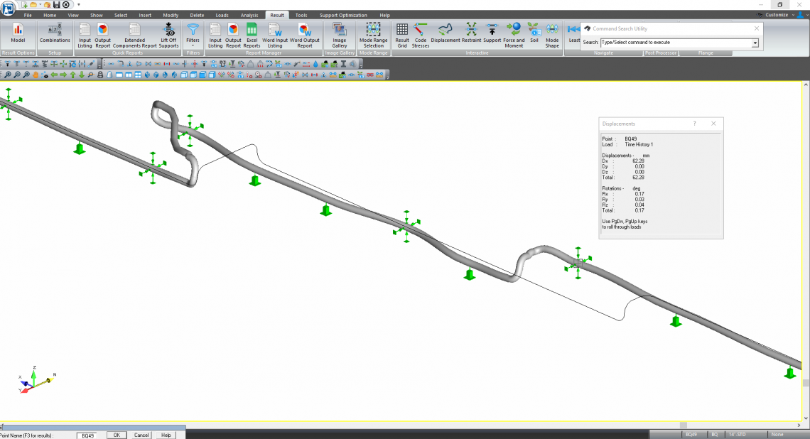 W ramach powierzonego nam zlecenia, naszym zadaniem było wykrycie przyczyny powstałej awarii, a następnie opracowanie rozwiązania zabezpieczającego instalację przed jej ponownym wystąpieniem. W tym celu w pierwszej kolejności wykonaliśmy wizję lokalną połączoną z inwentaryzacją stanu istniejącego. Na miejscu stwierdziliśmy znaczne przemieszczenie rurociągu, które skutkowało jego uszkodzeniem. Przy wykorzystaniu oprogramowania służącego do symulacji stanów dynamicznych układu oraz analizy naprężeniowej, odtworzyliśmy stan istniejący sprzed wystąpienia zjawiska. Tym samym udało nam się potwierdzić poprawność opracowanego przez nas modelu obliczeniowego oraz teorii dotyczącej przyczyn powstałego zjawiska.